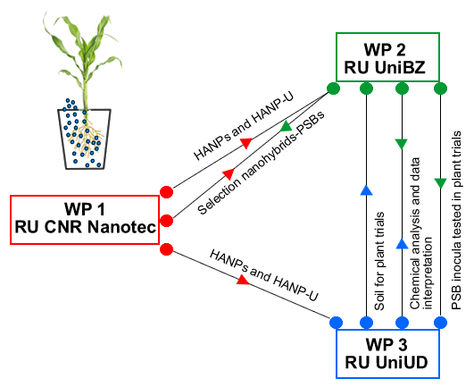 The RU UniBz will cooperate with CNR Nanotech for the selection of nanohybrids-P solubilizing bacteria to be characterized for the potential release of P. RU UniBZ will also be in charge of the preparation of PSB inocula, RU UniUD will test that within the greenhouse trials. In addition, the knowledge acquired during the experiments carried out by RU UniBz will be applied to the greenhouse experiments led by RU UniUD and for the interpretation of data.